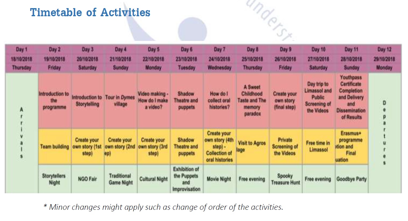 All the activities will be learner-centered and passive listening will be avoided. The working methods used will be non-formal education methods that will allow the participants to acquire new skills, learn, and share knowledge and ideas. The activities will include energizers, ice-breaking games, teambuilding exercises, interactive presentations, peer to peer education, experiential learning, group work, visits to museums, churches, youth clubs, workshops, role-playing, simulations, brainstorming etc. Particular workshops will be design for video-making, photography, storytelling, shadow theater and more. They will have the time to reflect on their own and in groups, based on what they will learn. The goal is for them to learn and then share this knowledge when they go back to their countries. Working methods will be adapted based on the participants’ characteristics, needs and interests.