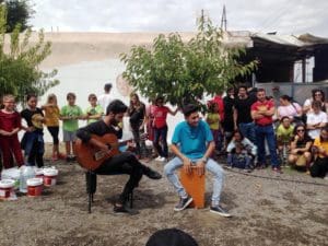 Hubo participación de la gente del barrio. Algunos han hasta tocado (como se puede ver en la foto donde aparecen dos habitantes de la Cañada entreteniendo a un público compuesto por mayoría da los padres de los niños y miembros de las ONGs).